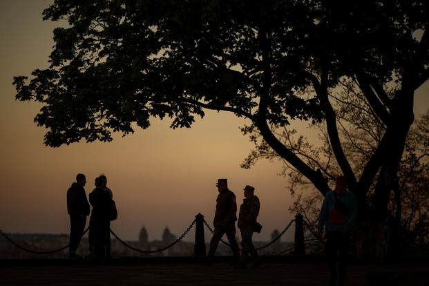 The troopers all saluted, nonetheless and quiet below blue skies, when U.S. First Army Command Sgt. Maj. Christopher Prosser gave the order to current arms.